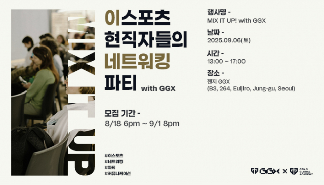 오는 9월 젠지글로벌아카데미(GGA)의 e스포츠 마스터 트랙(EMT) 수강생들이 준비한 e스포츠 현직자 커뮤니티 파티 ‘MIX IT UP! with GGX’가 열린다.